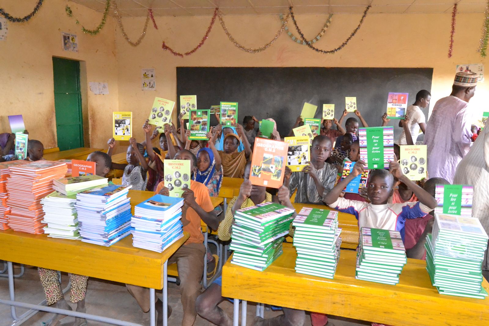 590 manuels pour CM1–CM2 et équipement de 5 classes (125 tables-bancs) — actions majeures à Kouarategui II.